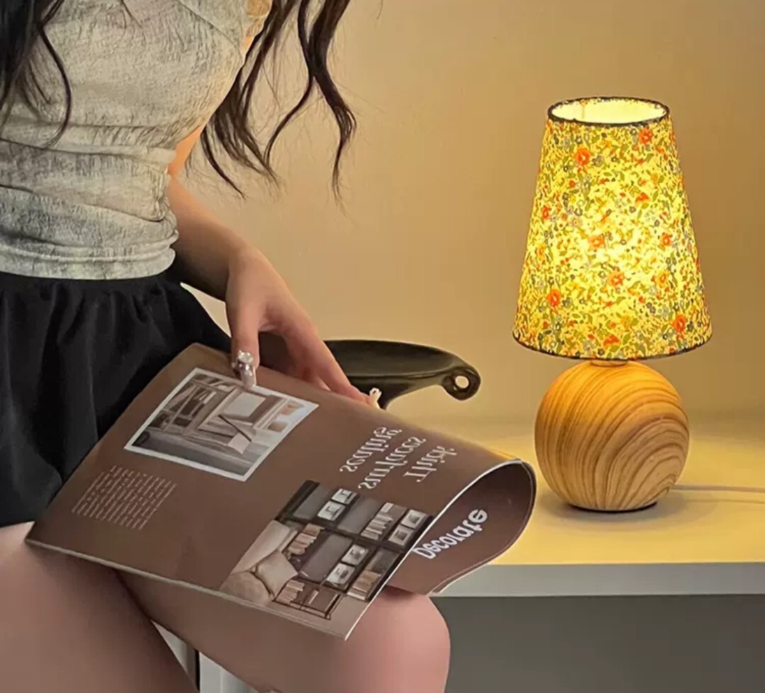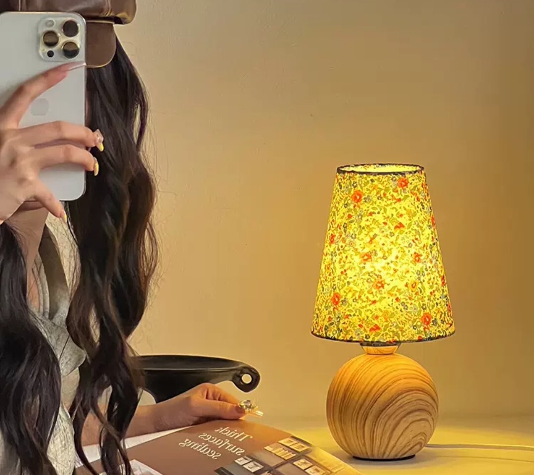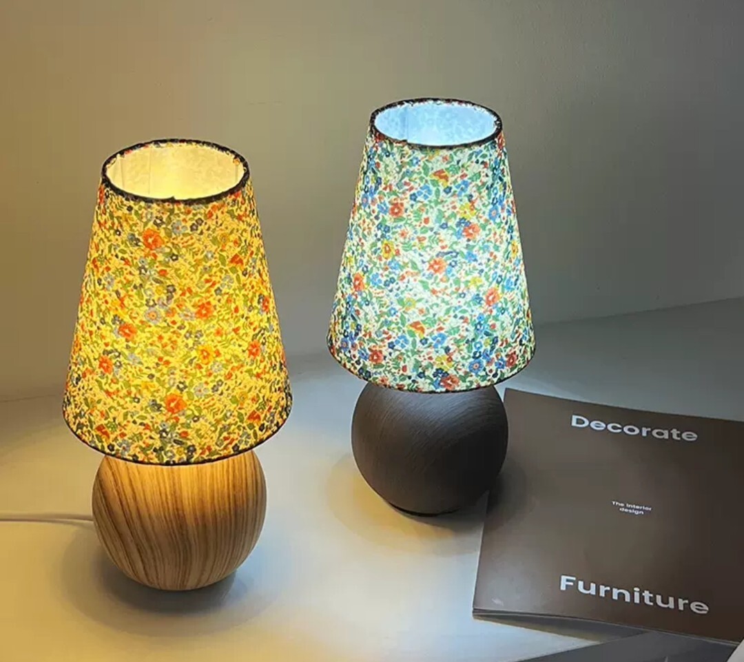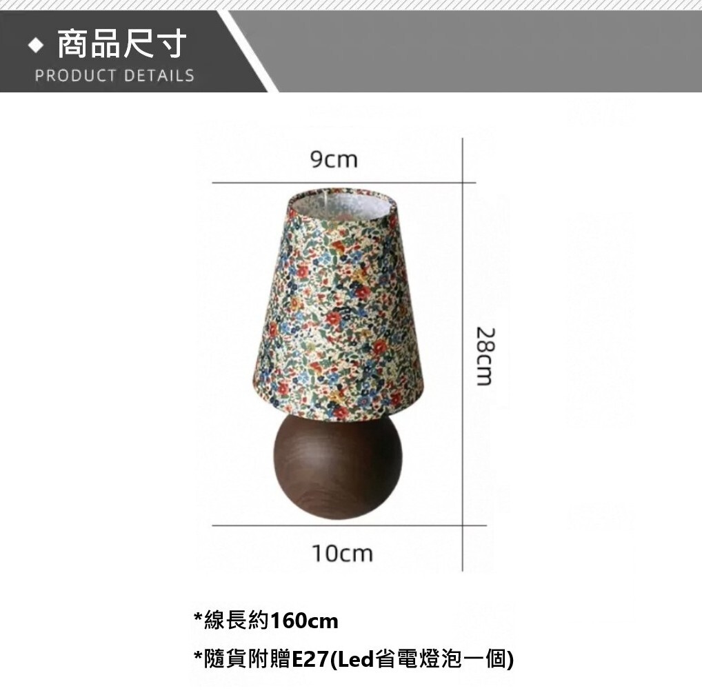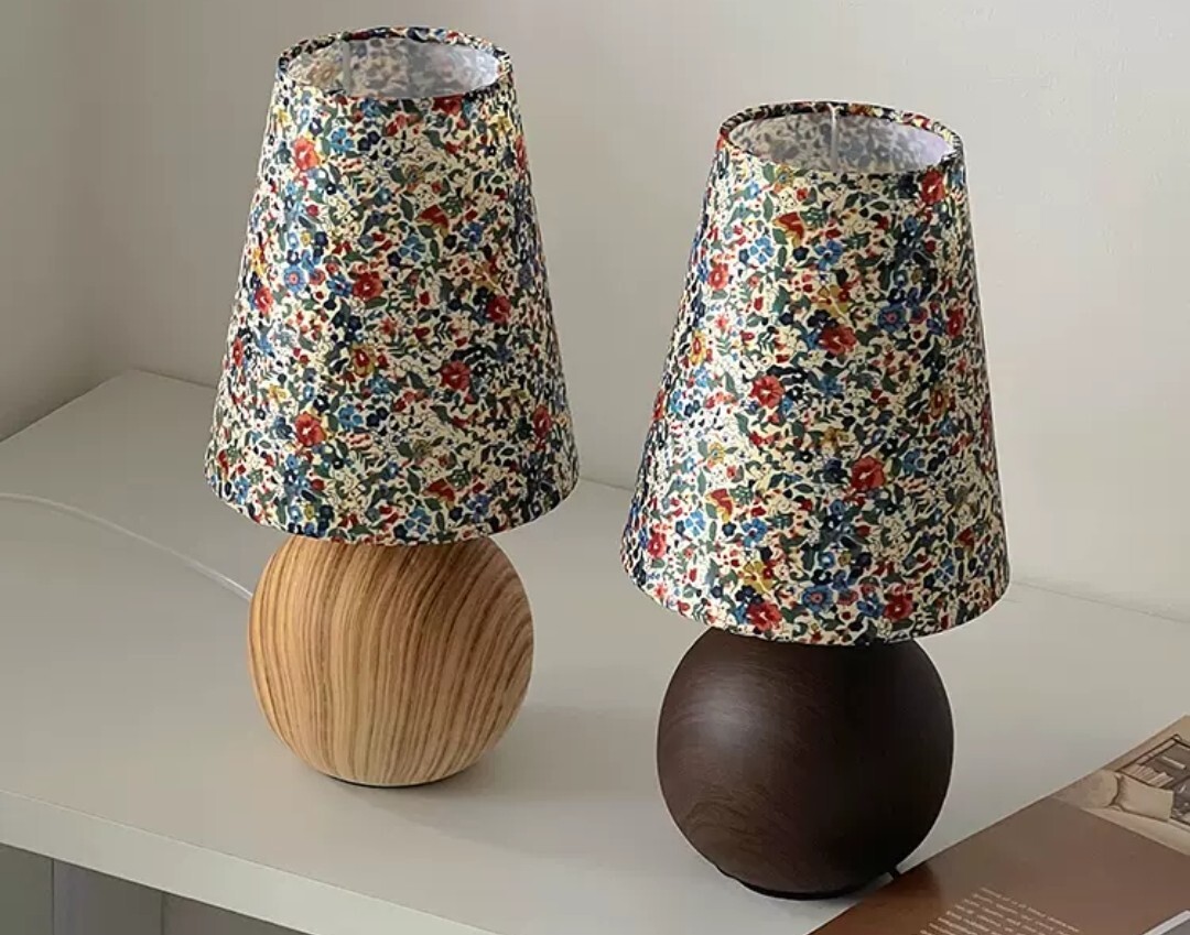 木紋底座自然溫潤,搭配柔和碎花燈罩