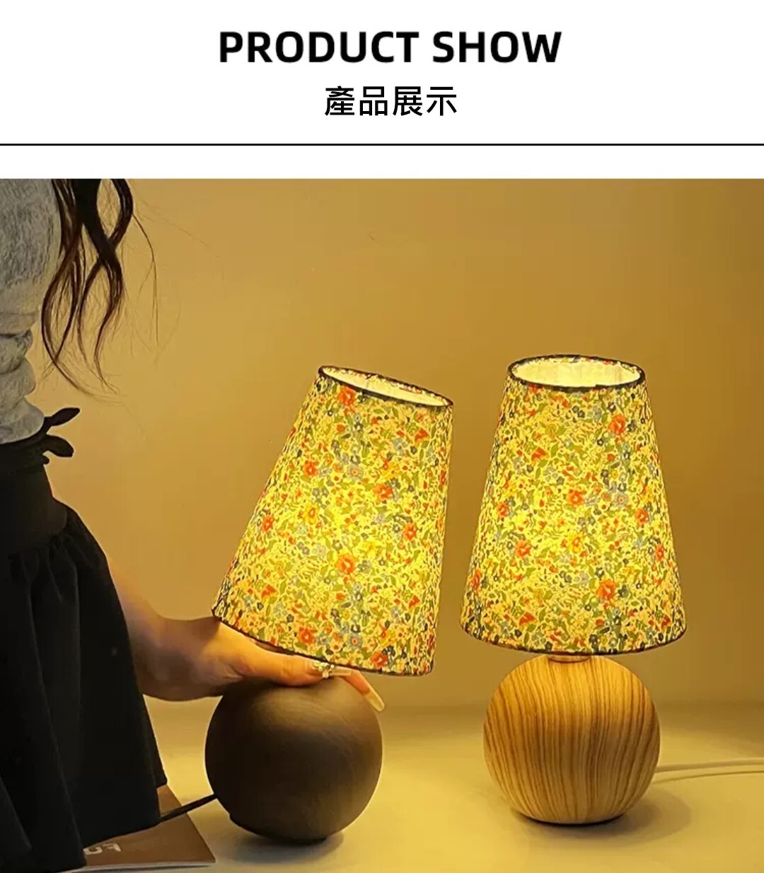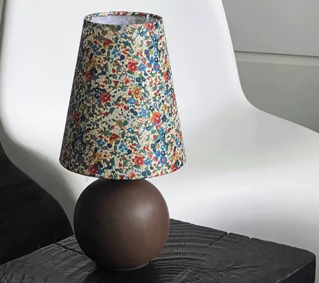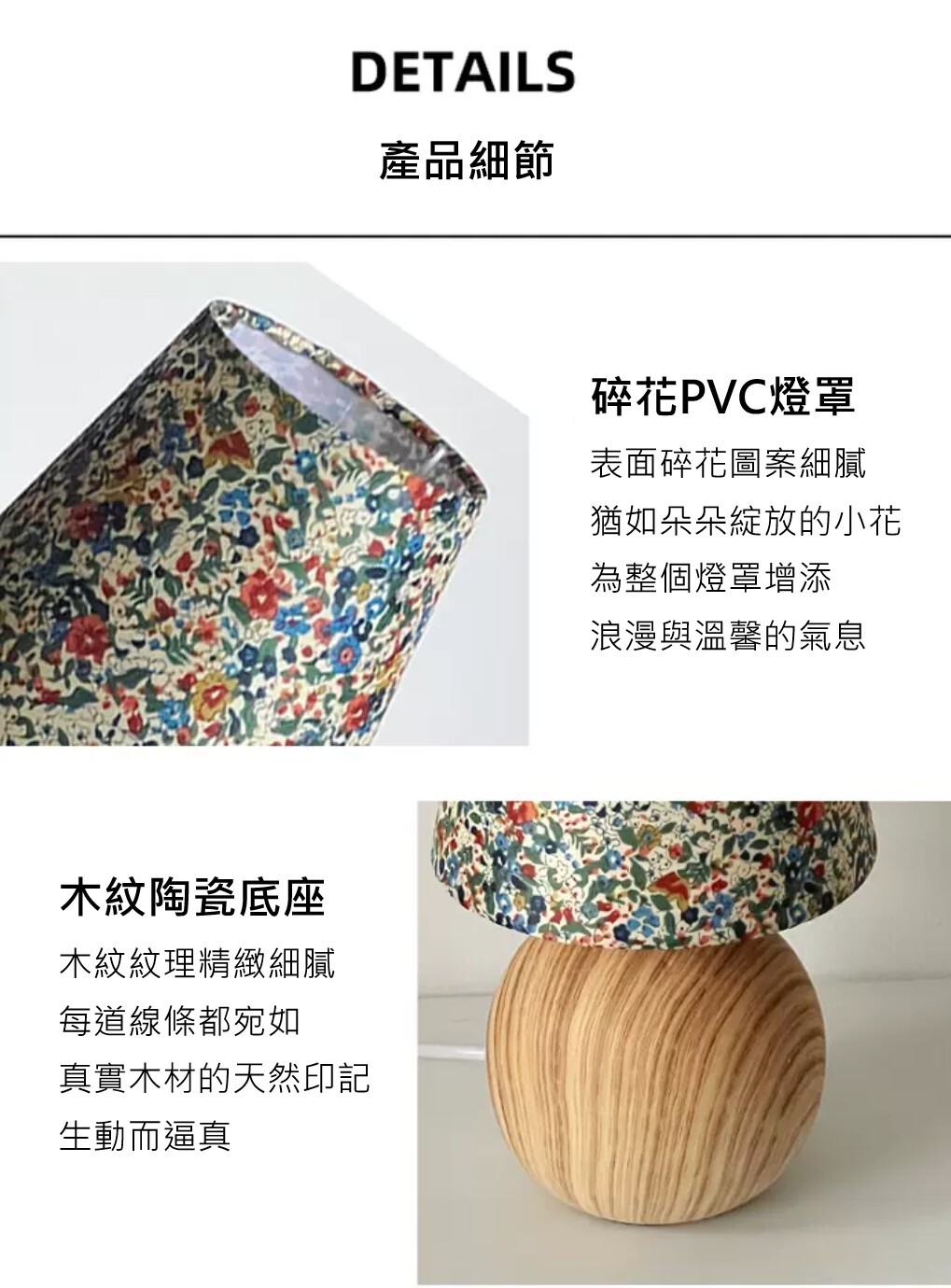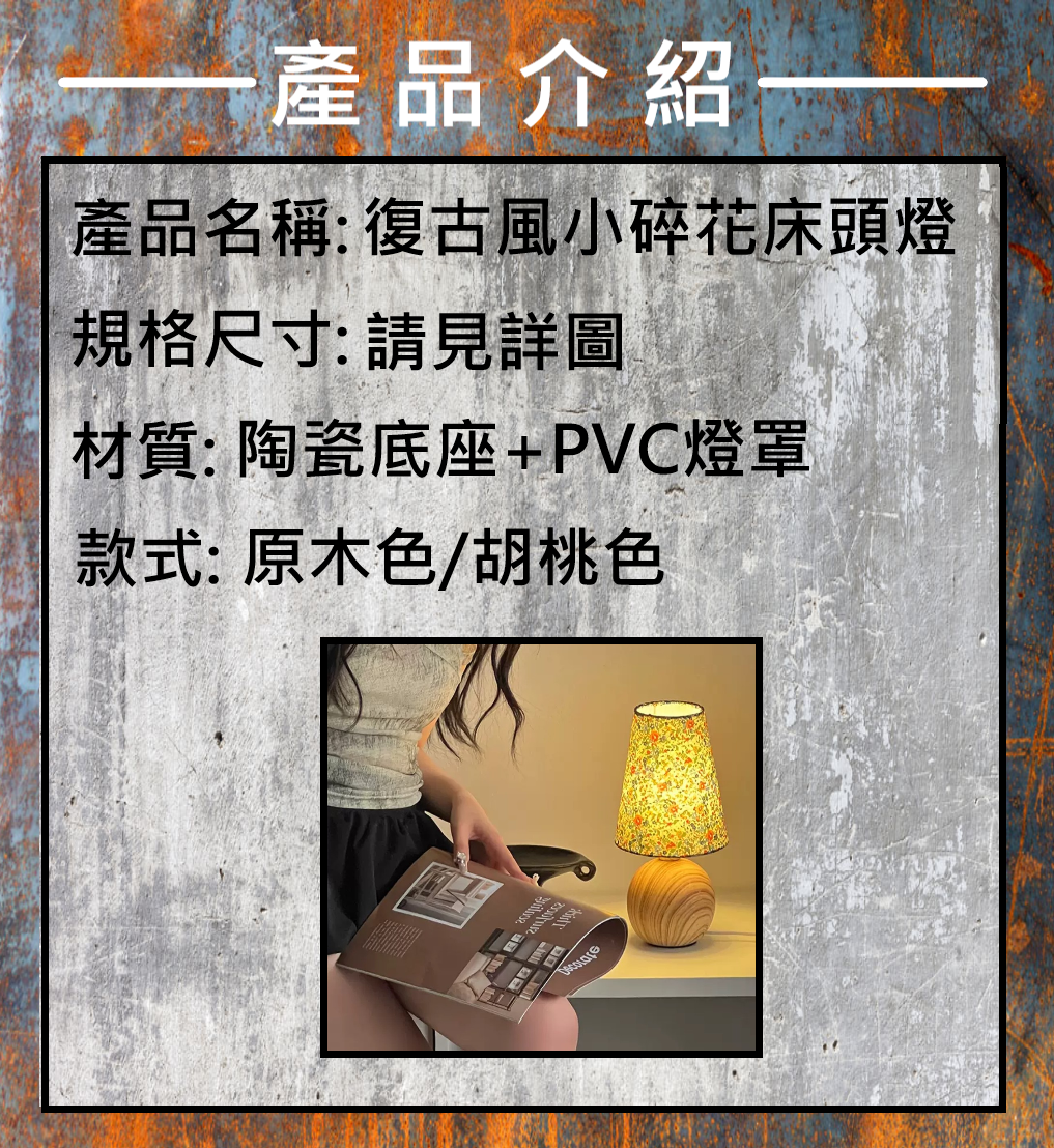 木紋底座自然溫潤,搭配柔和碎花燈罩