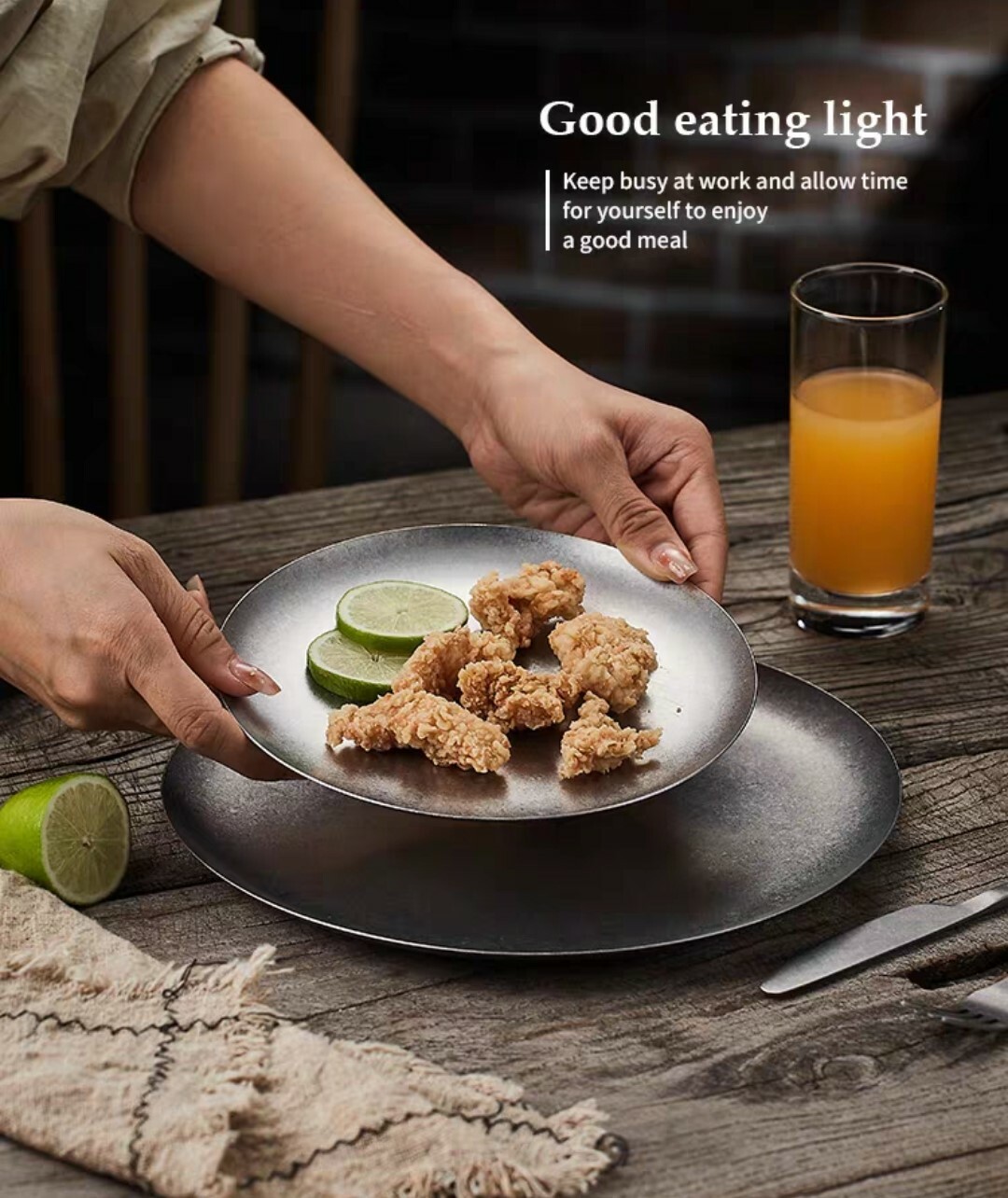 我們的工業風做舊不鏽鋼餐盤,以其獨特的質感
