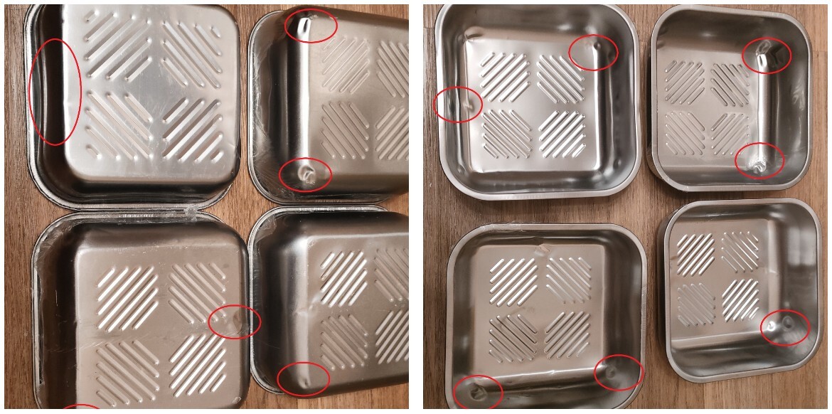 全新未使用 運送碰撞導致邊緣或底部大小不一凹陷痕跡(附圖紅圈)